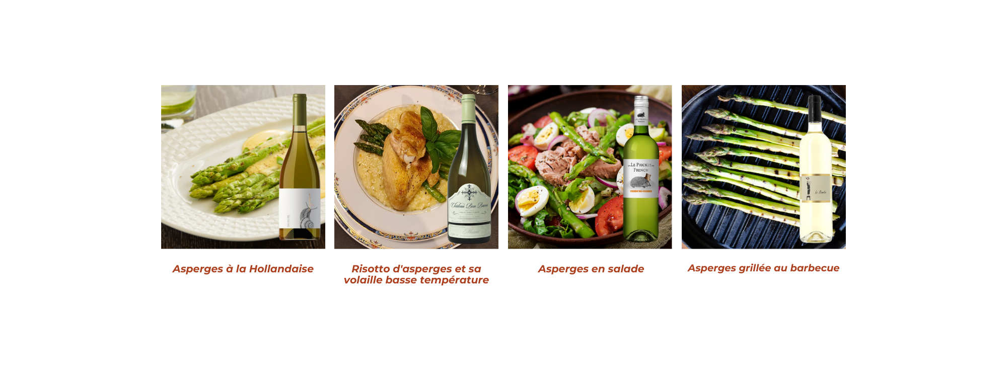 Pour accompagner la douceur des asperges, nous vous conseillons de partir sur un vin blanc fruité. Le Reposo blanc - Pago Casa Gran, avec sa bouche vive et fraiche, sublimera vos asperges à la Hollandaise, alors que le Muscat belge du Domaine Bon Baron accompagnera à merveile votre risotto d'asperges et sa volaille basse température.